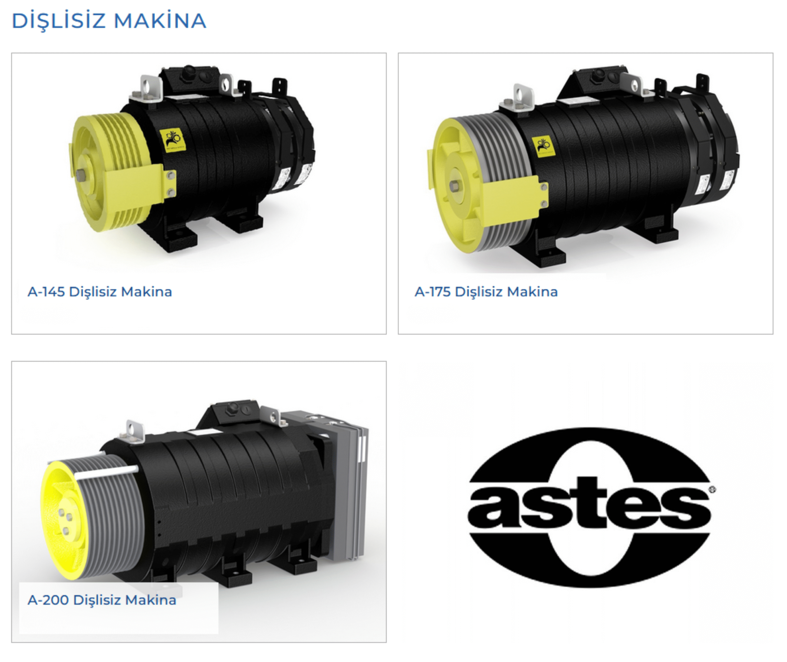 Astes markası, asansör motoru pazarında kalitesi ve güvenilirliği ile tanınan bir isimdir. Astes’in ürün gamı, özellikle Dişlisiz Makine çözümlerinde yoğunlaşır ve A-145, A-175 ve A-200 gibi çeşitli kapasite seçenekleri sunar. Bu dişlisiz makineler, hem yeni kurulumlarda hem de modernizasyon projelerinde yüksek verimlilik, sessiz çalışma ve uzun ömür beklentilerini karşılamak üzere tasarlanmıştır. Astes motorları, asansörlerinizin sorunsuz ve güvenli bir şekilde çalışmasını sağlamak için tasarlanmıştır. Web sitenizde Astes motorlarını öne çıkararak, müşterilerinize endüstriyel kalitede ve zamana meydan okuyan çözümler sunduğunuz mesajını verebilirsiniz.