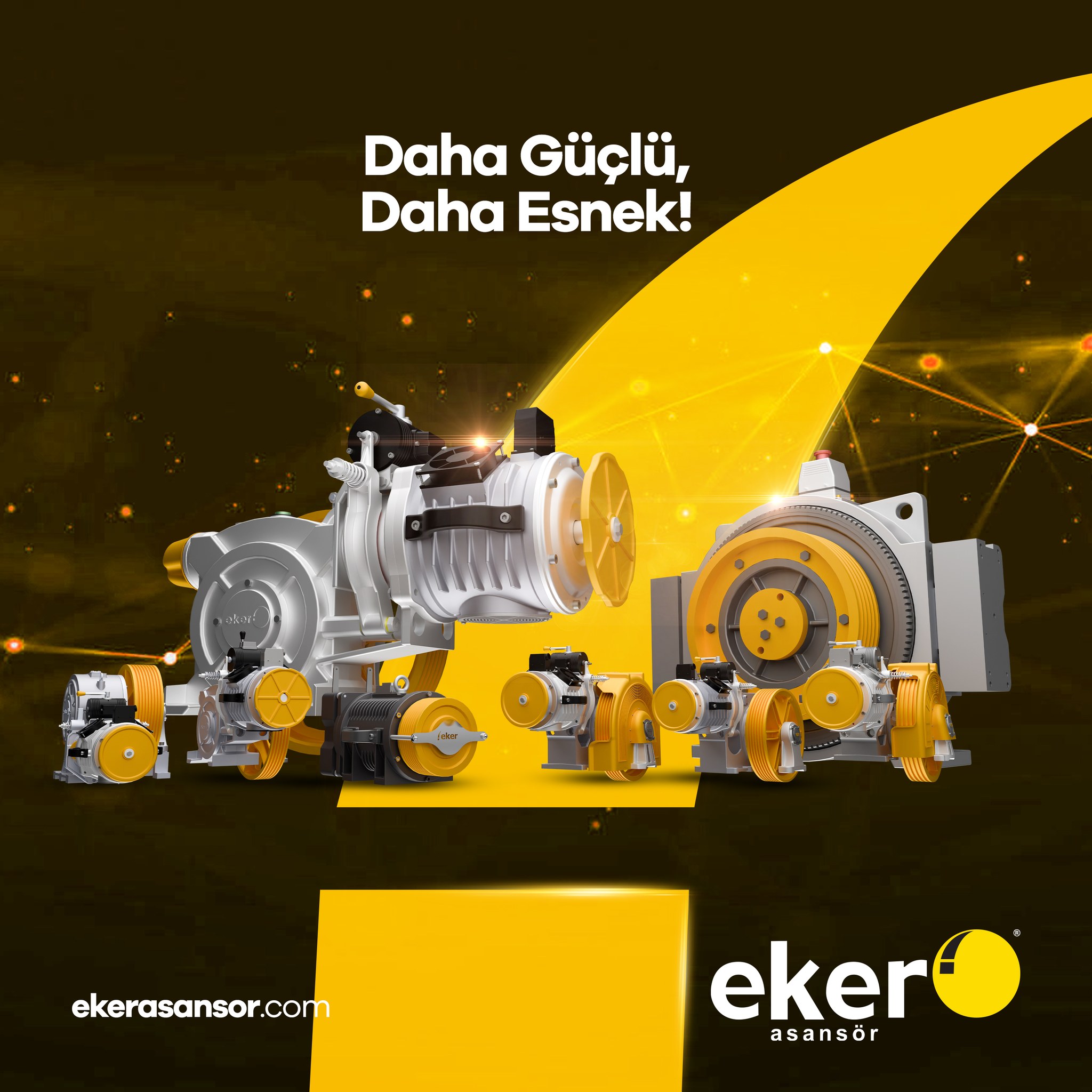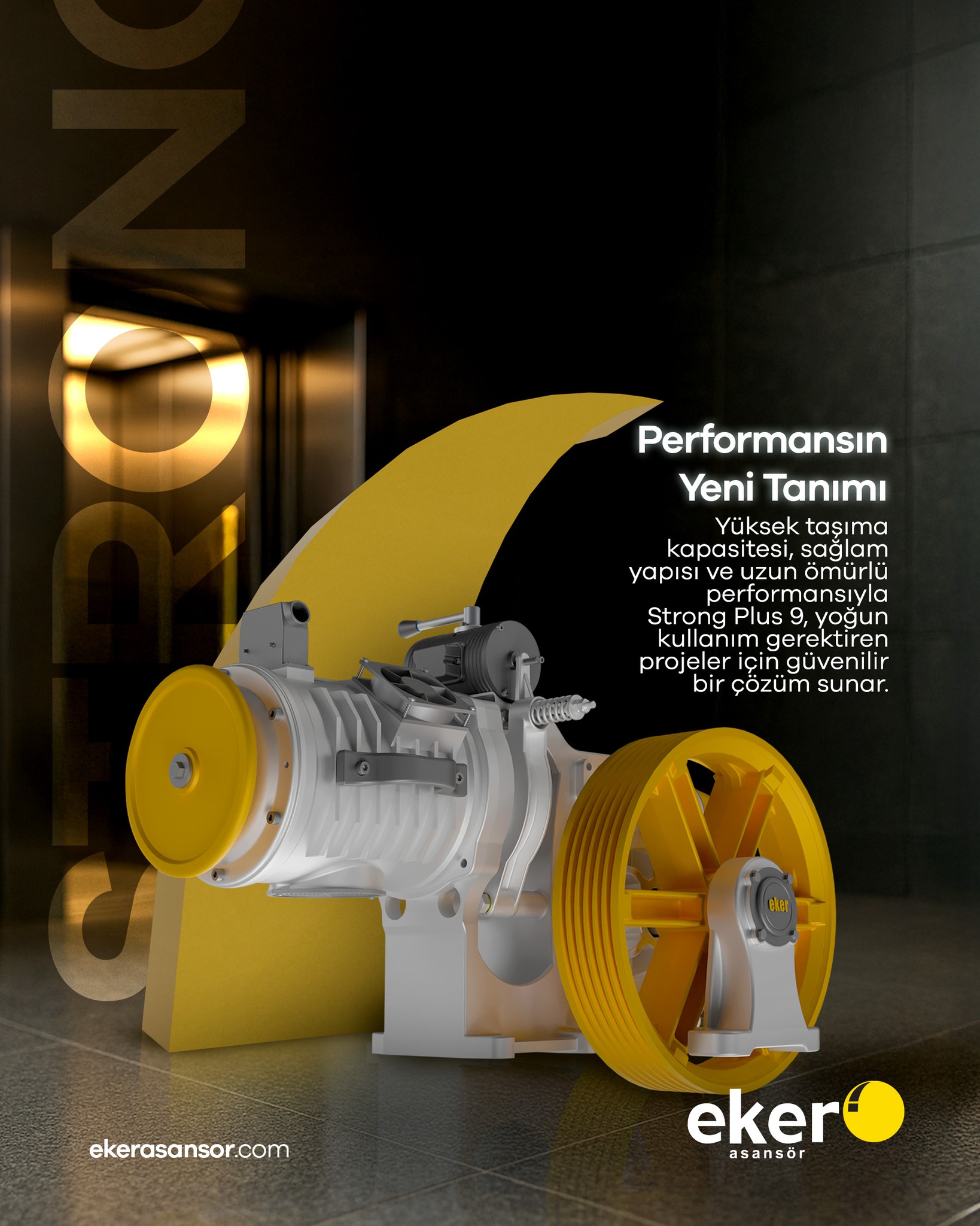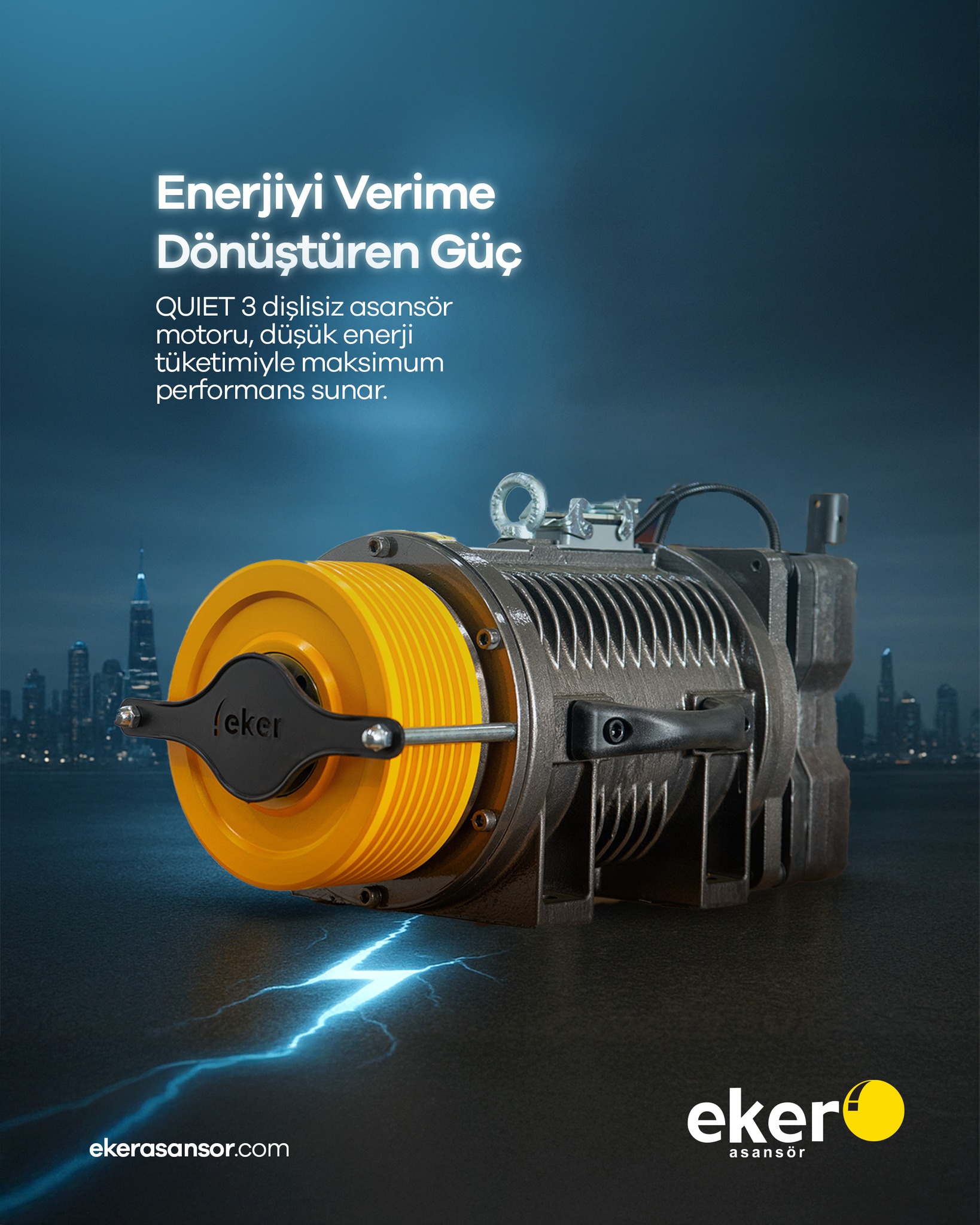 Eker Asansör, asansör motorlarında Performansın Yeni Tanımını sunar. Yüksek taşıma kapasitesi, sağlam yapısı ve uzun ömürlü performansıyla öne çıkan Eker motorları, özellikle Strong Plus 9 gibi yoğun kullanıma uygun çözümlerle güvenilir bir proje ortağıdır. Enerji verimliliğini önceliklendiren Eker, QUIET 3 Dişlisiz asansör motoru gibi ürünleriyle düşük enerji tüketimiyle maksimum performansı bir araya getirir. Bu dişlisiz teknoloji, enerjiyi verime dönüştüren güçlü bir performans sunarak işletme maliyetlerini düşürmeye yardımcı olur. Eker’in sarı ve gri temalı modern tasarımları, hem görsel olarak çarpıcıdır hem de “Daha Güçlü, Daha Esnek” motor çözümleriyle sektördeki teknolojik liderliğini vurgular.
